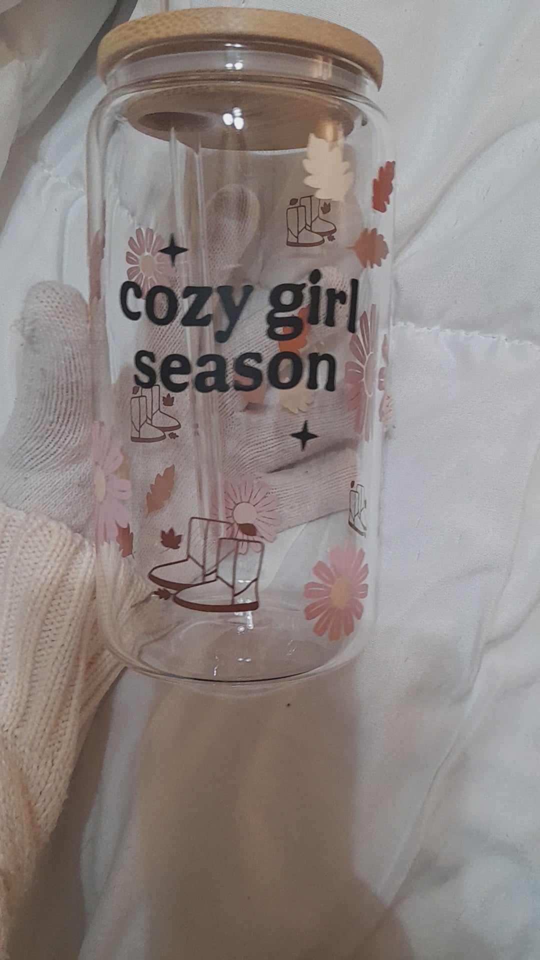 Cute cold season themed tumbler/beer can glass. Pastel tones of pink, browns and beige. 16 ounces made of temperature proof glass with a wooden baboo lid. Comes with its own straw and cleaning brush! Perfect for everyday morning coffees or that afternoon warm tea blend.